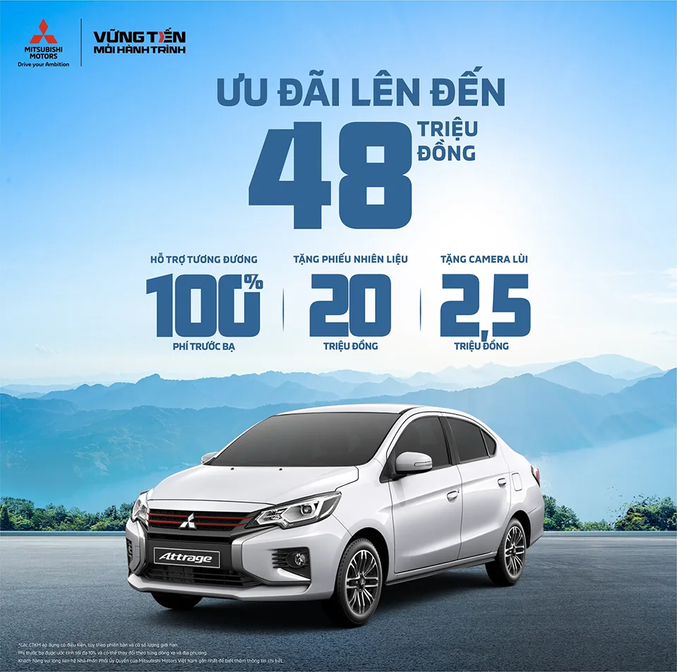 Khách hàng lựa chọn mẫu sedan tiết kiệm nhiên liệu, Attrage, sẽ nhận được hỗ trợ 100% LPTB cho phiên bản MT, quà tặng phiếu nhiên liệu và camera lùi. Phiên bản CVT Premium có tổng giá trị hỗ trợ lên tới 46 triệu đồng.
